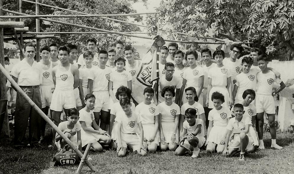 Escola Comercial, Torneio de Atletismo em Maio de 1959. Uma foto do acervo de Luís Baptista (EUA) que foi repassada por Rui Francisco (Macau). Diz o Rui que é o primeiro à esquerda da bandeira da escola.