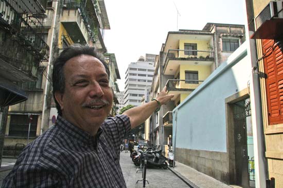 António Machado Mendonça (Brasil) aponta para o prédio onde morou