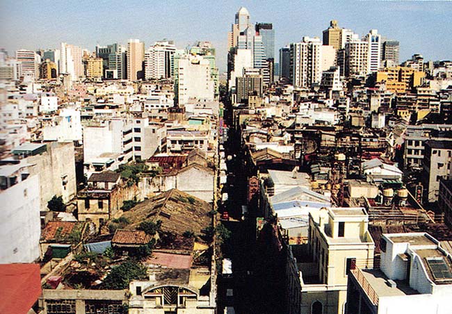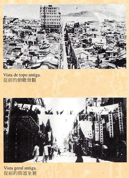 Na revista da edição 15 Anos do Instituto Cultural de Macau (1982 – 1997) “Na Afirmação de Uma Identidade”, como uma prestação de contas do que foi feito em Macau, foi publicada esta interessante foto (provavelmente 1993 ou 1997), que particularmente não tinha visto, tirada do alto (topo) da Av. Almeida Ribeiro. Na época, de 1989 a 1993, vários prédios passaram por um processo de restauração que custou MOP 3.744.720,00 com o apoio da Fundação Oriente: