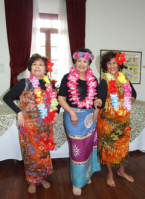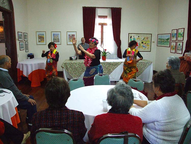 Após o almoço, a Mariazinha (1ª da esquerda da foto), a dama do patuá de S.Paulo, me segura no braço e avisa “não saia da sala que vai ter uma surpresa”. E lá apareceram as 3 acima, todas vestidas de havaianas.  Procuravam lembrar uma antiga festa da CMSP nos anos 90 chamada Noite de Hawai em que houve até um concurso de Miss Hawai.  Naqueles tempos, todos eramos mais jovens e com mais disposição, nada mais óbvio !!! É engraçado fazer esta singela observação, mas é objeto de conversas quando se fica a imaginar o que fazer nas festas.  Outrora, nos anos 80 e 90, era fácil, tinha muito mais gente e mais jovens uns 20 anos, havia disposição para qualquer coisa.  Hoje, já menos gente e envelhecidos, nossas atividades são mais limitadas. Uma constatação e um espelho do que é a comunidade macaense nos dias de hoje.