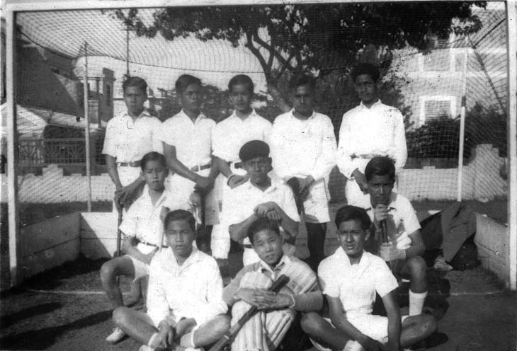 Foto tirada no ano de 1940. Uma parte da Seleção de Hóquei de Macau. De pé: João Nolasco, Alexandre Airosa (Chaine) e José dos Santos Ferreira (Adé). De joelhos: Rigoberto do Rosário (Beto) e Laertes da Costa.