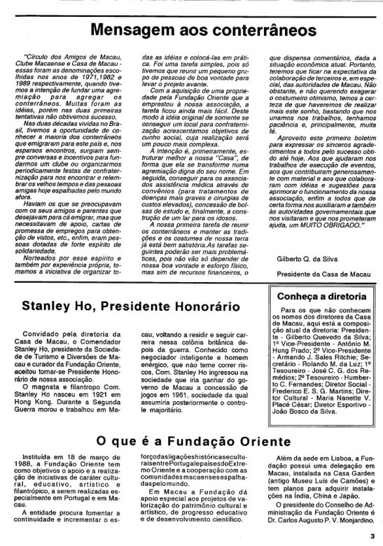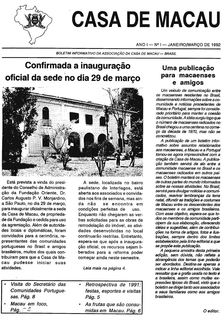 Novamente revirando os meus arquivos e bugigangas, achei este boletim histórico, que foi o 1º editado pela Casa de Macau de São Paulo há pouco mais de 19 anos quando estava em vias de inaugurar a sua Sede. A Casa foi fundada há 22 anos e alguns meses e o Boletim nº 1 – Janeiro de 1992, quanto tempo … eramos mais jovens e muita gente ainda estava viva. Saudades! Veja abaixo a capa e a página 3 com a mensagem do seu 1º presidente, Gilberto Silva, além da composição dos corpos sociais dessa gestão. O Boletim completo, editado por Eduardo Alberto Chau Ribeiro “Palito”, será publicado no site Projecto Memória Macaense, seção de Comunidades Macaenses. (clicar nas imagens para aumentar e ler os textos):