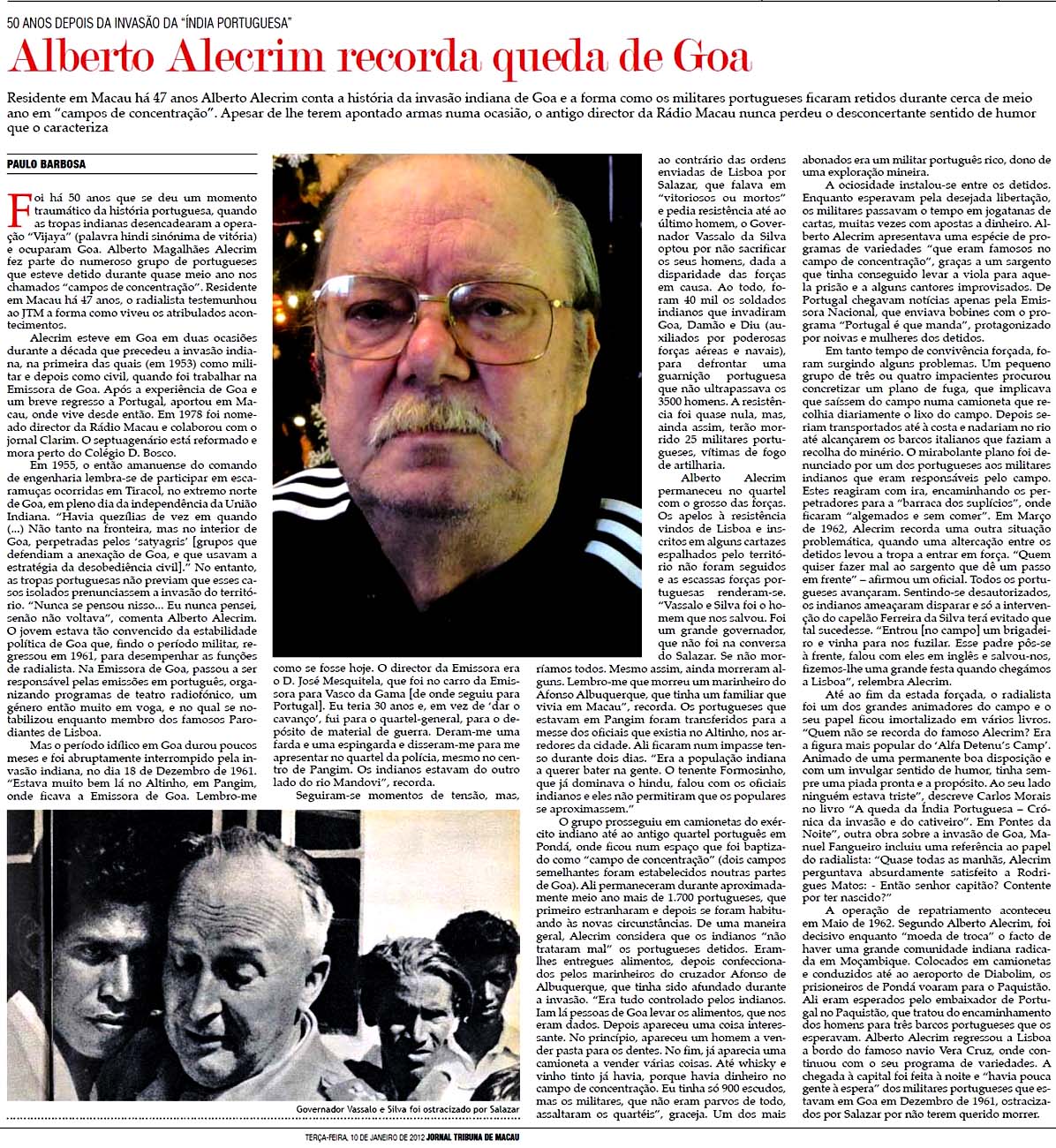 3) Alberto Alecrim recorda a queda de Goa: Foi uma experiência de vida e tanto para o Alecrim, de estar presente naquele momento histórico do fim da Índia Portuguesa em Dezembro de 1961. Viveu a história!!! Cedo ou tarde as colónias portuguesas de Goa, Damão e Diu, no território indiano, iriam ser devolvidas ou retomadas pela Índia. Pena que foi com o uso da força. E também lamentável que o retorno das tropas portuguesas a Portugal tenha sido ignorado, como se tivessem sido “traidores ou covardes” ao se recusarem a lutar “até o último homem”. Teria sido um massacre dada a superioridade militar indiana. Lembro bem que naquela época com 11 anos de idade, movido por um grande sentimento patriótico, fiquei a nutrir um ódio danado dos indianos, e por um bom tempo: