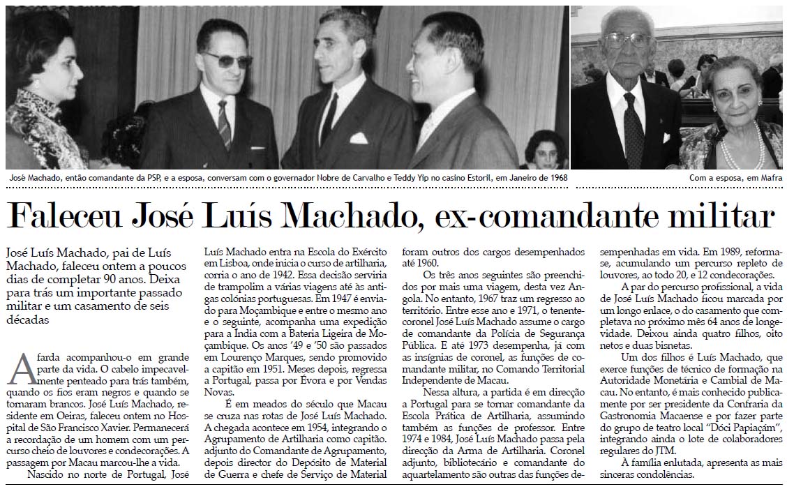 a) Falecimento: Notícia triste do falecimento de José Luís Machado. Era o pai do Luís Machado que é presidente da Confraria da Gastronomia Macaense (em Macau) e um dos integrantes do grupo teatral Dóci Papiaçam di Macau (teatro em patoá de Macau). Ao amigo Luís Machado e à família as nossas sinceras condolências: