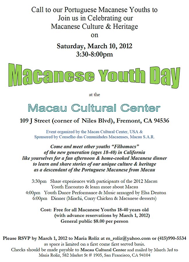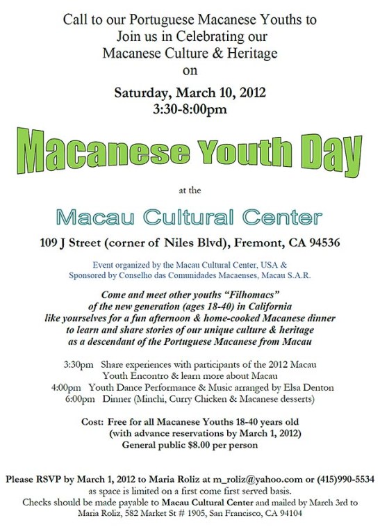 Um convte aos jovens macaenses portugueses para juntarem-se a nós para celebrar a nossa herança cultural macaense no sábado, 10/03/2012 das 15:30 às 20:00 horas