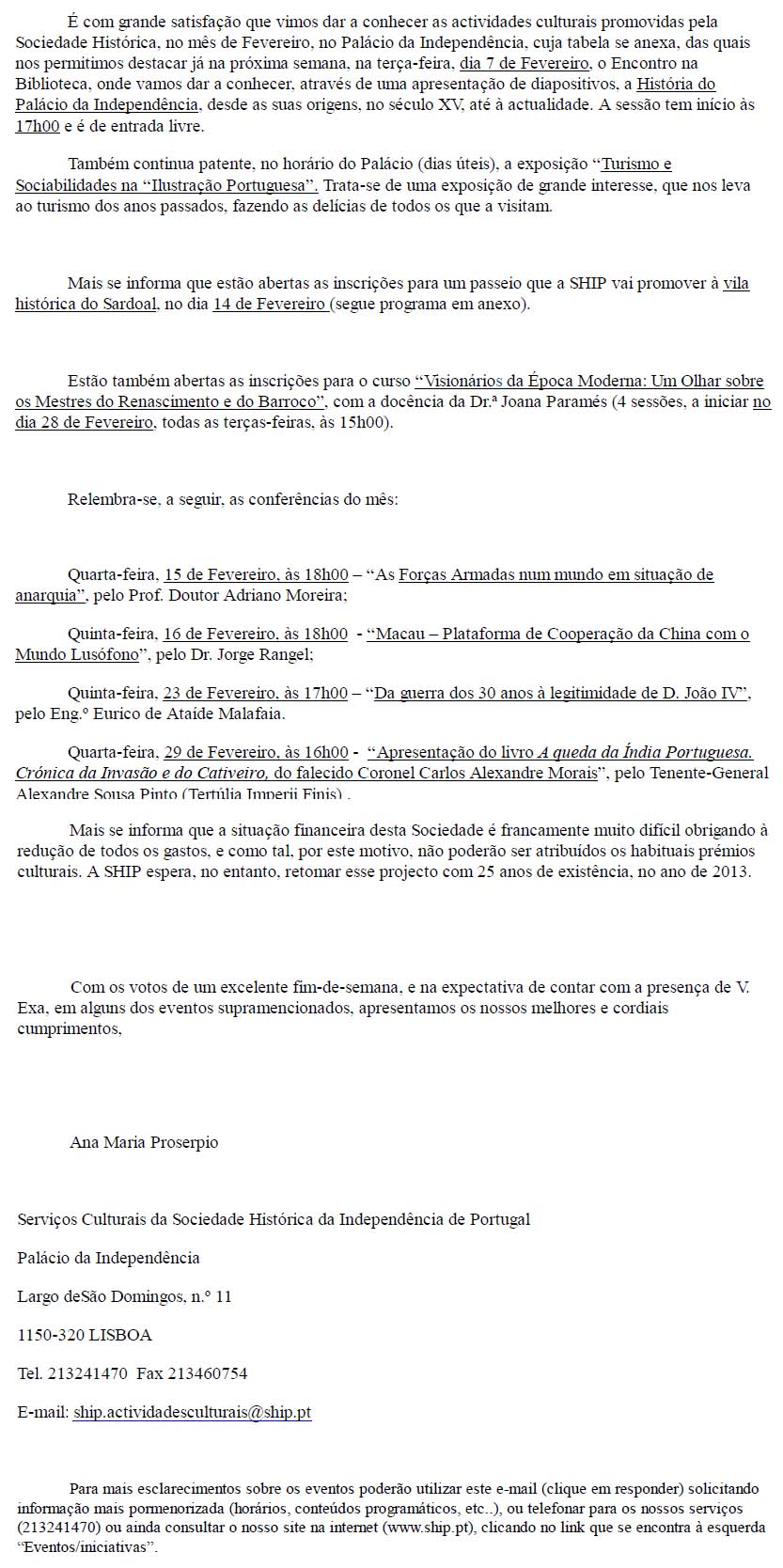 E-mail recebido da Ana Maria Proserpio dos Serviços Culturais da Sociedade Histórica da Independência de Portugal (SHIP), comunica suas actividades no mês de Fevereiro. Aos residentes em Portugal, veja na imagem abaixo (clicar para aumentar) se todas ou alguma é de seu interesse: