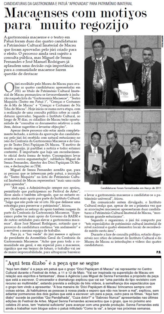 Veja como o Jornal Tribuna de Macau, edição de 09/Fev, publicou a respeito: