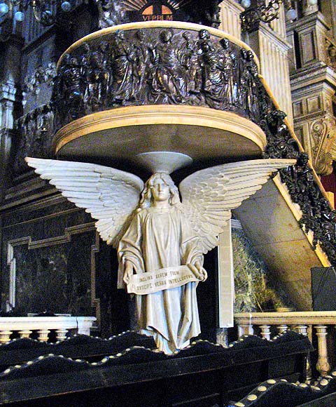 Do projeto de Francisco Roscio só permanece a fachada. A cúpula, toda em Pedra de Lioz de Lisboa, representa a principal marca visual da igreja, construída, em estilo neoclássico, entre 1865 e 1877. O revestimento interior, ao invés de talha de madeira à maneira portuguesa, é todo de mármore. Possui interessantes vitrais de cores vivas. As duas capelas laterais são dedicadas ao Santíssimo Sacramento e à Nossa Senhora das Dores. O teto da nave principal apresenta seis grandes painéis do pintor João Zeferino da Costa, narrando as origens da igreja. As portas foram esculpidas em bronze, por Teixeira Lopes, e fundidas em Bruzy, na França. (texto do site CyCity Rio de Janeiro)