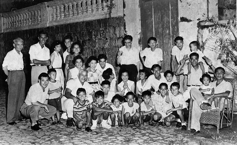 Esta fotografia foi tirada em frente da casa do Sr. José Carion (Largo da Companhia) e a muralha da trás é o Asilo dos velhos. Os garotos/garotas na primeira linha da esq. para direita – Carlos de Lemos (Naio), Arnaldo de Lemos, Adelaide de Lemos, Fernando Carion, António Carion, Sonny Amante Gomes ?, Alfredo Augusto Pereira. A garota no colo do Manhão (sentado) é a Ivone Carion. A rapariga atrás do Sonny Amante Gomes é a Lucila Carion. O rapaz atrás do Arnaldo Lemos é o António Fong. O senhor de cabelos brancos atrás do Carlos de Lemos é o pai do Sonny Gomes e o rapaz de pé ao lado dele é o Rogério Carion ((Jeio) e o senhor de joelhos ao seu lado é o Sr. Gaspar (pai do Jeio). O senhor atrás do Gaspar é o Sr. Plácido Carion.