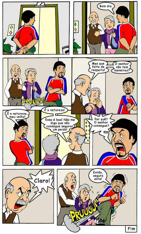 Unga domingo di chuva-frio,  cusa vai fazê? Sâm  chocá na casa olá televisám-ia.  Direpente iou-sa amiga brasiléra telefoná: “Mariazinha, estou preparando um panelão de feijoada brasileira e como sei que gosta, venha junto com o Chicoi para jantar conosco”.  Feijoada brasiléra, iou nádi faltá! Tufám No.10 iou tamêm lôgo sai di  casa.  Assi nôs dôs dále  capa, enrolá cascol na pescoço, azinha azinha corê vai casa di iou-sa amiga comê  feijoada brasiléra.  Nôs rufá qui ravirá. Cavá inchí bariga, anôte-anôte, iscuro-iscuro-ia, sâm ora di voltá pa casa.   Quelóra isperá elevador chegá, estopôr di Chicoi  co cara marêlo qui marêlo virá pa iou falá: “Ai Mariazinha, iou non pôde aguentá más-ia, iou querê tirá pum”. Cusa? Ne bom astrevê fazê seléa asnéra.    Olá, nôs dôs empido chipido nunga coredor pichote, bafado, sim porta nim janela, ispéra estunga elevador antigonso qui nunca más chegá. iou certo lôgo pegá saván co estunga fedor di pum.  Chicoi di cara marêlo agora já virá ficá vérde falá:  “Iou prometê qui nádi tirá pum fêde”.  Cusa,  vôs querê iou acreditá?    Tudo pum sâm fêde, agora pum di fijám ne bom falá-ia, nuncassá somente fêde, sâm podre di fêde.