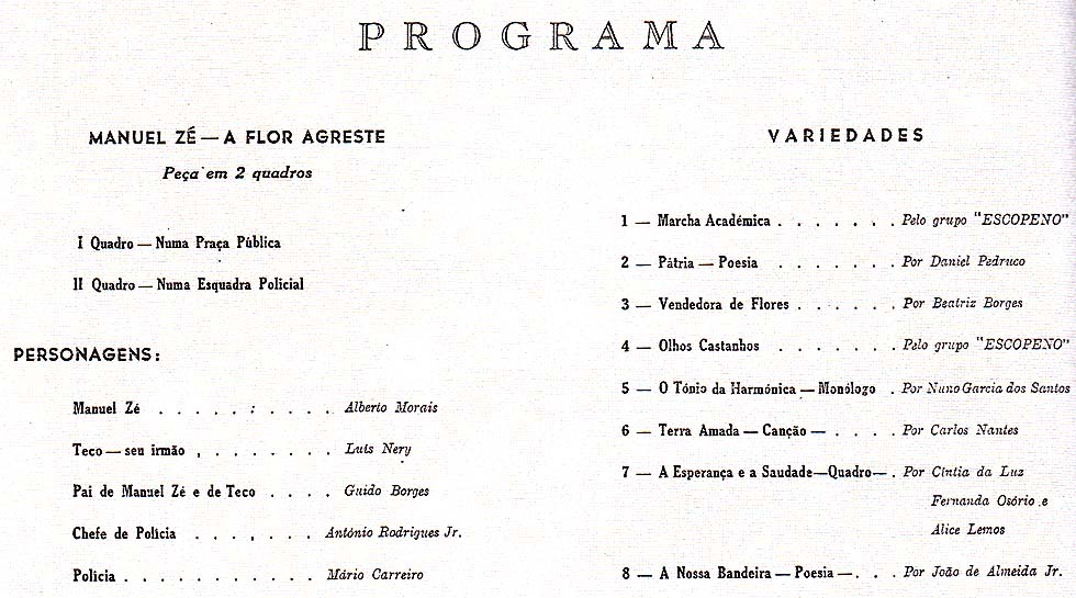 “A peça em 2 quadros intitulada “Manuel Zé-A Flor Agreste”, agradou pela sua brevidade, interessante lição moral e desembaraço dos jovens personagens que nela intervieram: os alunos Alberto Morais, Luís Nery, Guido Borges, António Rodrigues Jr. e Mário Carreiro.