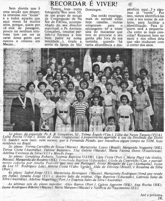 O macaense Jorge “Giga” Robarts tinha publicações no diário Jornal de Macau (devidamente corrigido pelo Giga), nos anos 80, com o tema “Recordar é Viver”, aliás uma frase muito popular até os dias de hoje. Esta que publico abaixo é de 1987, provavelmente Julho, informação obtida no verso do recorte de jornal através de anúncio do Leal Senado. A Mariazinha Lopes Carvalho gentilmente quis partilhar o recorte com a comunidade macaense e enviou-me para publicação. Agradeço muito, pois as fotos antigas do meu arquivo são limitadas e sempre dependo de colaboração dos conterrâneos, escassa hoje em dia, mas entendo, os tempos mudaram desde que lancei o site Projecto Memória Macaense em 2003, uma vez que outros meios de comunicação tal como a rede social Facebook, hoje em dia, já tomam o lugar de um blog ou site criados para esta finalidade. Só resta adaptar-se aos novos tempos até que estes recomendem a saída do ar, ou uma alteração de direcionamento do conteúdo.