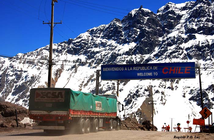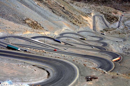 Estrada sinuosa e emocionante leva a Portillo a 2.850 metros de altura. A grande circulação de caminhões/camiões é devido à rota via Cordilheira de Andes que liga Argentina ao Chile.