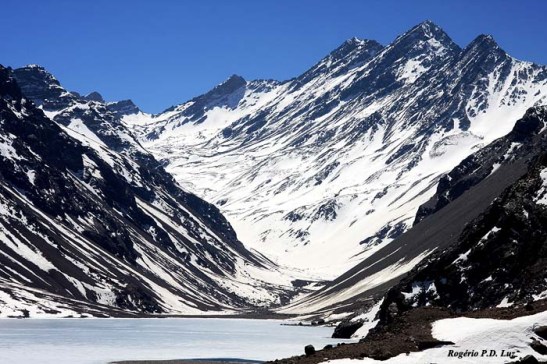 A Lagoa Del Inca com suas águas congeladas e as montanhas da Cordilheira de Andes para a prática de esqui.