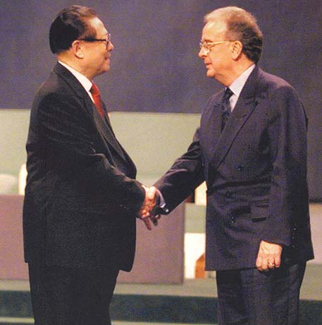 O Presidente da R.P. da China Jiang Zemin cumprimenta o Presidente de Portugal Jorge Sampaio na cerimónia de transição de Macau.
