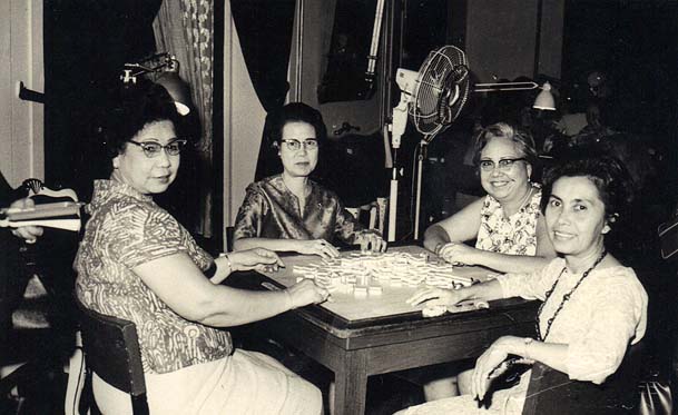 Uma mesa de jogo Má cheók (Mahjong) no Clube Macau, em Macau, nos anos 60. Da esquerda: Dina Tavares, Marcelina Luz (mãe do autor deste blog), Carmem Estorninho (minha tia) e Amélia Ferreira.