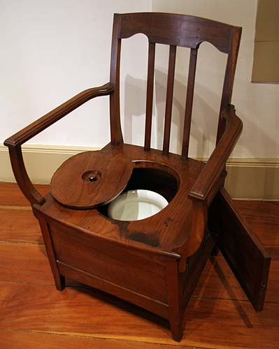 Em meados do século 19 ainda não havia sistema de água encanada. Numa casa rica, urinóis ou penicos eram usados nos quartos e podiam ficar dentro deste tipo de cadeira ou guardados em criados mudos. Os escravos recolhiam a sujeira em barris para depois despejá-la fora. Esta é uma cadeira de uso feminino. Nas de uso masculino, o orifício central acompanhava a anatomia do corpo masculino (texto do museu).