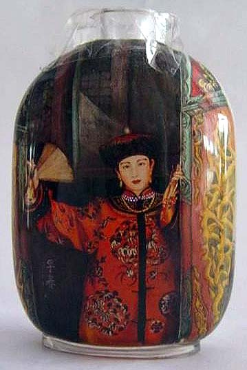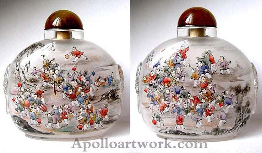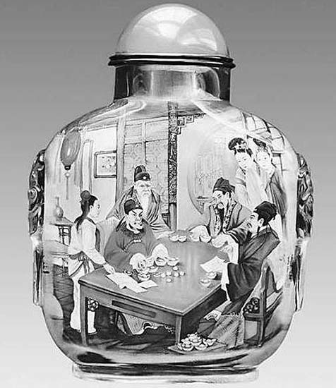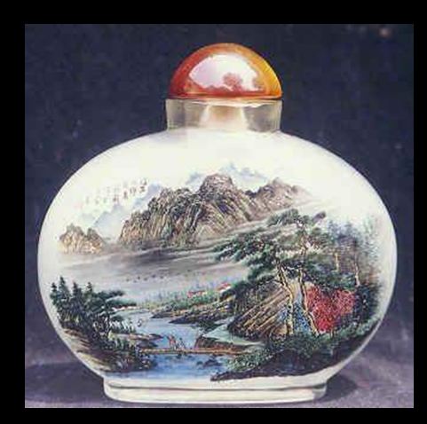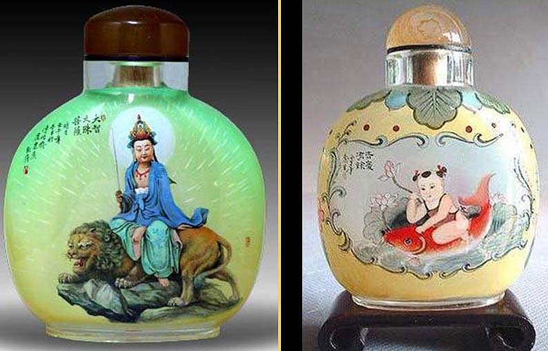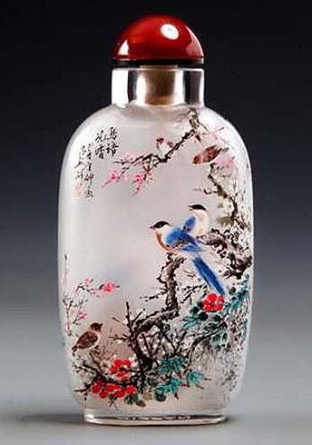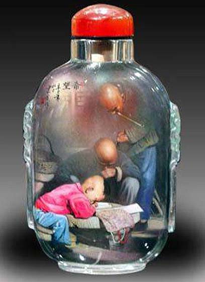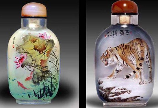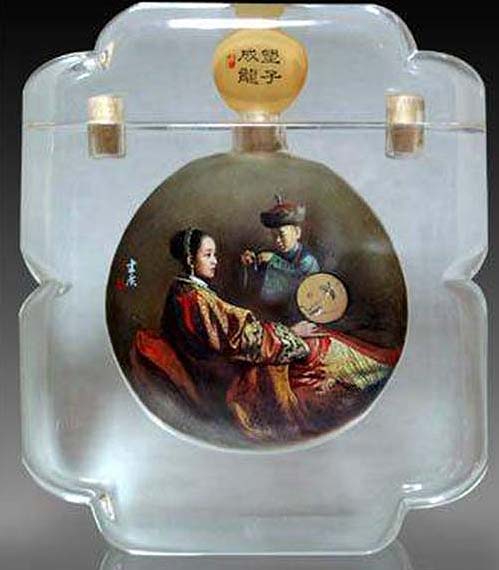 O tabaco chegou à China nos finais da Dinastia Ming (1368 – 1644), pelo que as garrafas de tabaco se desenvolveram gradualmente. A habilidade com estas garrafas foi muito florescente na dinastia Qing (1644 – 1916). A pintura dentro da garrafa de tabaco apareceu na época do Imperador Qing Jia. Esta habilidade continuou e é agora muito procurada. É uma forma de arte única. Utiliza-se um pincel delgado especialmente desenhado com uma curva na ponta, o qual é introduzido pelo gargalo. Um artista experiente trabalha no pequeno espaço da cavidade da garrafa e é capaz de gravar desenhos vivos e caligrafia na superfície interior da garrafa. O resultado é uma série de esquisitas miniaturas de paisagens, comestíveis, retratos e caligrafia que encantam muitos colecionadores. (texto de um pps sem autor)
