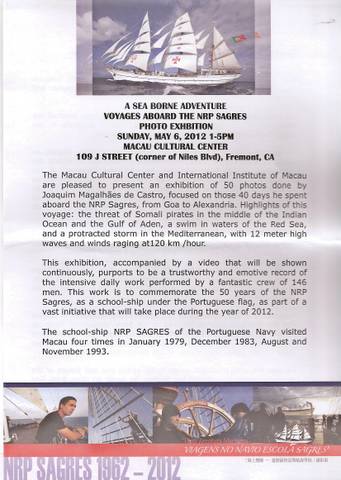 The International Institute of Macau and the Macau Cultural Center presented a Photo Exhibition of the Portuguese school ship NRP SAGRES at the MCC building in Fremont on Sunday, May 6th, 2012. The exhibit had 50 photos done by Joaquim Magalhaes de Castro which focused on the 40 days he spent aboard the NRP SAGRES from Goa to Alexandria. This Exhibit, accompanied by a video which was shown continuously, purports to be a trustworthy and emotive record of the intensive daily work performed by a fantastic crew of 146 men. This Photo Exhibition was to commemorate the 50 years of the NRP Sagres as a school-ship under the Portuguese flag, and is part of a vast initiative that will take place during the year of 2012.