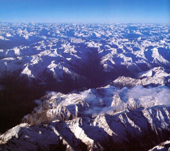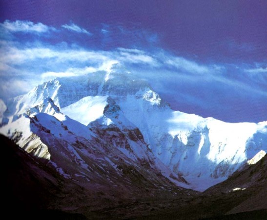 Abaixo, o Pico Qomolangma se estende pela fronteira da China com o Nepal. Com 8844,43 metros acima do nível do mar, é o pico mais alto do mundo.