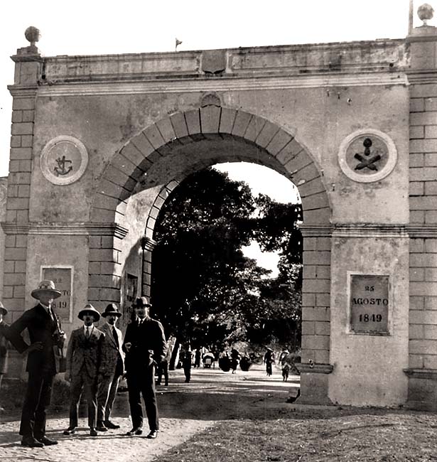 «Obra construída segundo o plano que achámos delineado, tendo sido inaugurado o seu acabamento, por ordem do governo da colônia, no dia 31 d’Outubro (1871) anniversario natalicio de S. Magestade Fidelissima El Rei o Sr. D. Luis 1.° Este cerco construido no caminho principal, que de Macau segue a varias povoações chinas é dedicado á memória do benemérito exgovernador — João Ferreira do Amaral, á tomada de Passeleão, conforme se acha publicado no Boletim Official do governo n.° 44, de 30 do referido mez».