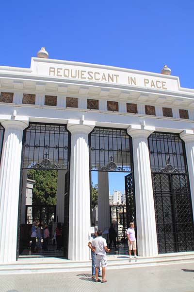 Cemitério de Recoleta: O pórtico neo-clássico, com colunas clássicas e símbolos sobre o tema da morte