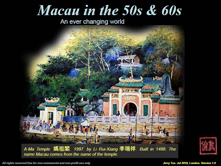 Templo A-Ma, em pintura de Li Rui-Xiang em 1997, construída em 1488. O nome Macau deriva do nome do templo budista.