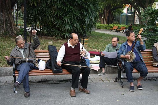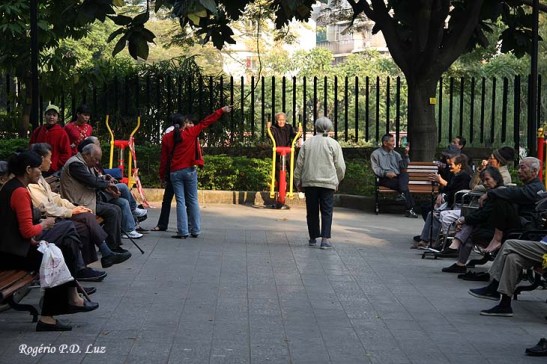 Convívio da população chinesa da terceira idade e equipamentos para ginástica que o Jardim Luís de Camões disponibiliza à população