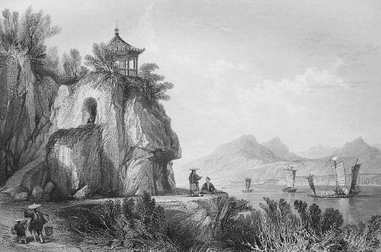 gravura do mirante da Gruta de Camões de autoria de Thomas Allom 1843 (origem: grupo Fotos Antigas de Macau II no Facebook, postagem de Luís Dias)