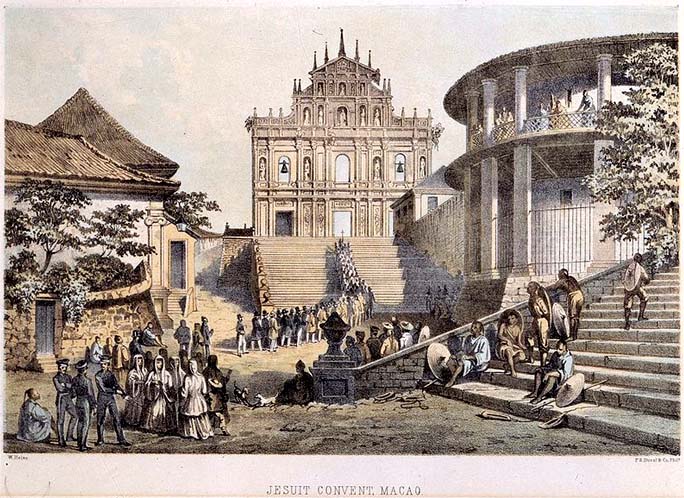 A Igreja da Madre de Deus ou Igreja de São Paulo e o Colégio, numa gravura do que teria sido antes do incêndio que a destruiu sobrando a fachada.