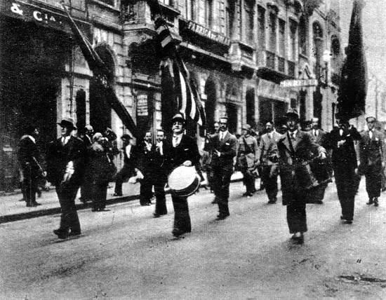 Desfile de voluntários pelas ruas paulistas em 1932, com a banda executando músicas marciais