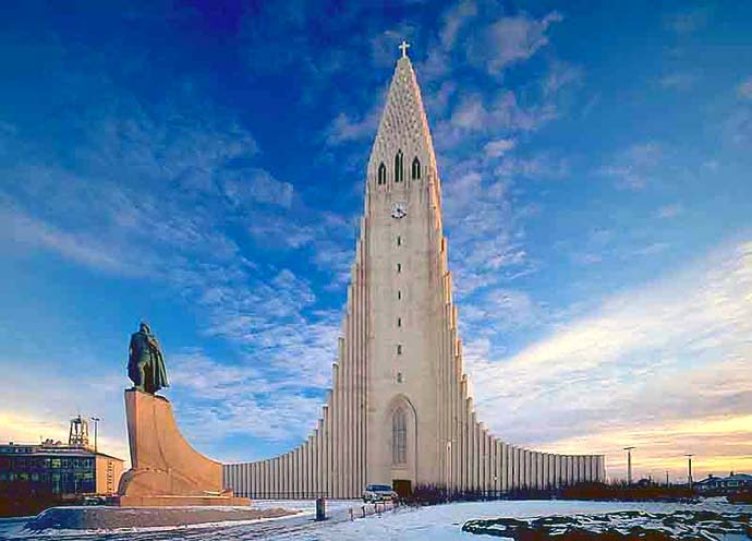 Hallgrímskirkja, ou Igreja de Hallgrímskirkja, é uma igreja luterana localizada em Reykjavík, capital da Islândia, possui 74,5 metros (244 pés) de altura e é a maior igreja na Islândia e na sexta a estrutura mais alta na Islândia (o maior edifício). Foi inaugurada em 1986. O seu desenho foi projetado para imitar o movimento da lava de um vulcão. Em suas partes mais altas, acima do seu campanário, oferece vistas esplêndidas da cidade. (Wikipedia)