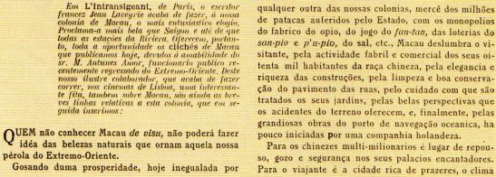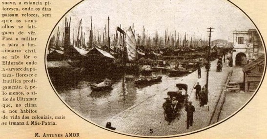 Durante anos, a Illustração Portugueza (ou, na nova grafia, Ilustração Portuguesa, na 2a série) foi divulgando, com maior ou menor destaque, a vida, os costumes e os acontecimentos da colónia portuguesa na China. Um ano antes de suspender a publicação da 2a série, em 21 de Abril de 1923, dedica a capa a Macau (o que terá acontecido pela primeira vez) e ocupa quatro páginas com uma reportagem fotográfica de M. Antunes Amor (também autor do texto e retratado em medalhão ao alto do artigo), funcionário público recentemente regressado do Extremo-Oriente…