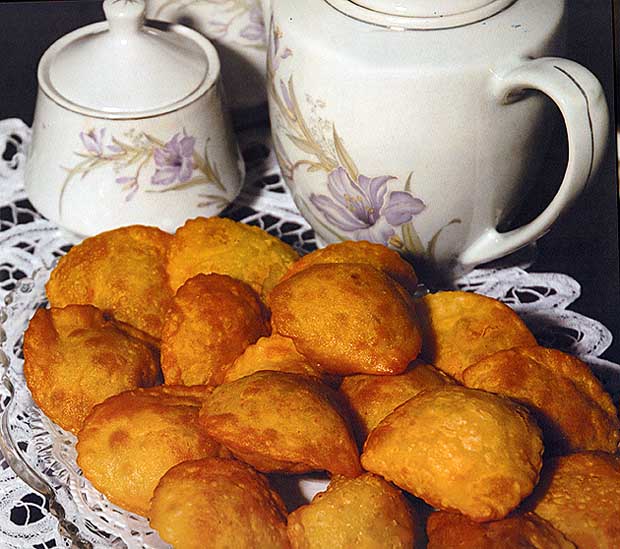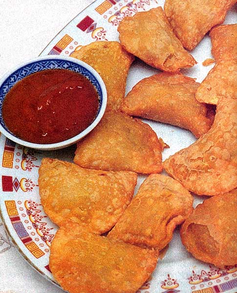 (Recheio: Para fazer o minchi, fritar uma cebola picada, em pouco óleo, deitar uma colher de chá de açafrão e logo a seguir 300 gramas de carne de porco picada, temperada com sal, pimenta e uma colher de chá de fécula de milho. Fritar até ficar seco e solto. Pode-se juntar pedacinhos de batata ou nabo ao minchi).