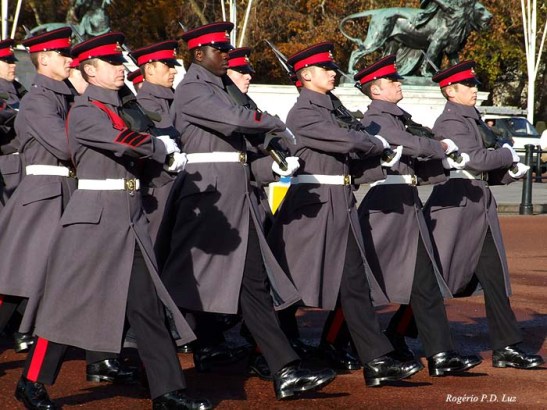 Defronte ao Palácio de Buckingham fica o Victoria Memorial ou Memorial da Rainha Vitória erguido em 1911. Nesta troca da guarda esperava-se ver os soldados de túnica vermelha, mas eram, pelo que se parece conforme pesquisa na internet, os guardas do Worcestershire and Sherwood Foresters Regiment, também qualificados de guardas reais, que logo depois tiveram o nome do regimento alterado e mudados de quartel para outra cidade.