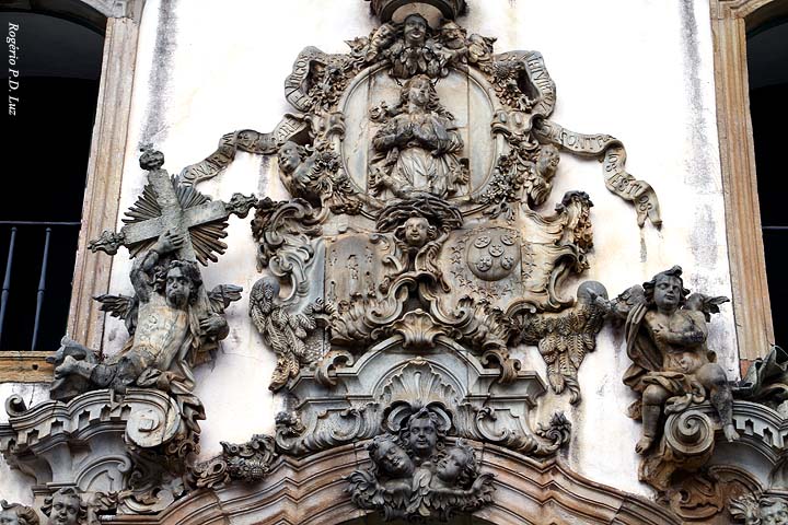 Portada: o entalhe da fachada de pedra-sabão é desenho de Aleijadinho, mas não se sabe se foi executado por ele ou por seus auxiliares