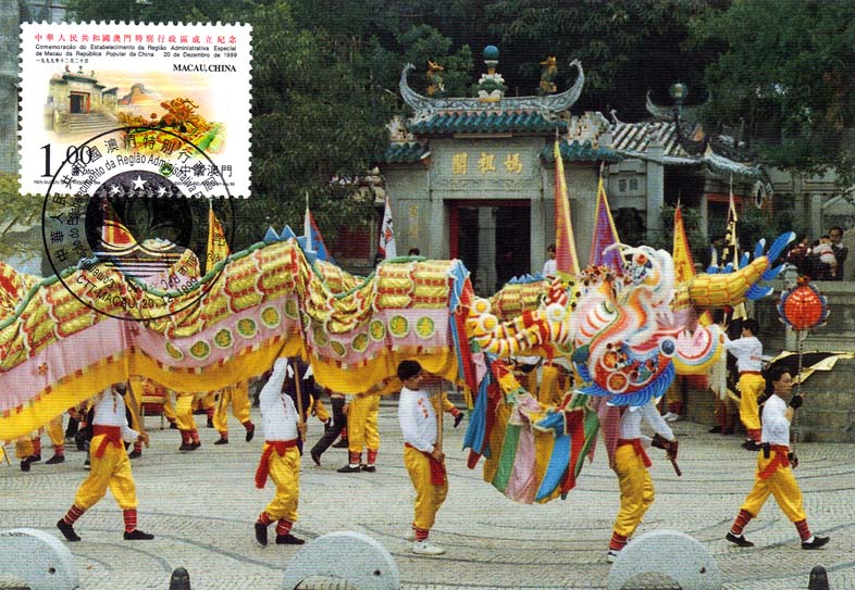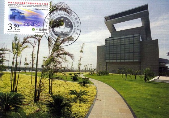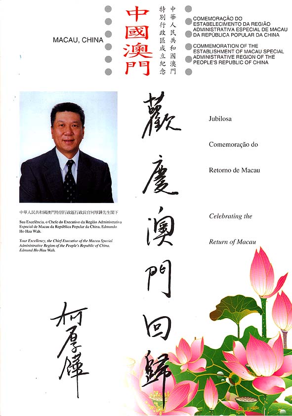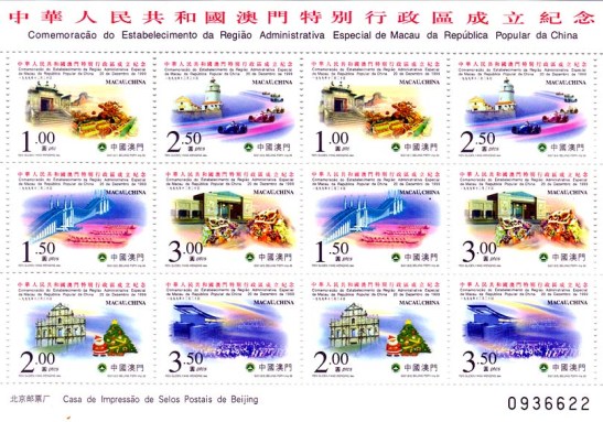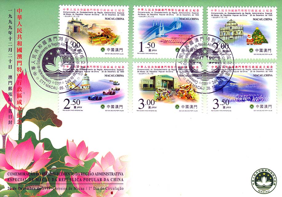 “Comemoração do Estabelecimento da Região Administrativa Especial de Macau da República Popular da China” é o título da emissão de selos no dia 20 de Dezembro de 1999, comemorando “grandiosamente o evento do retorno de Macau à pátria“, tal como consta do folheto/bloco acima, cuja coleção é composta por selos, postais e envelopes que estão publicados nesta postagem.