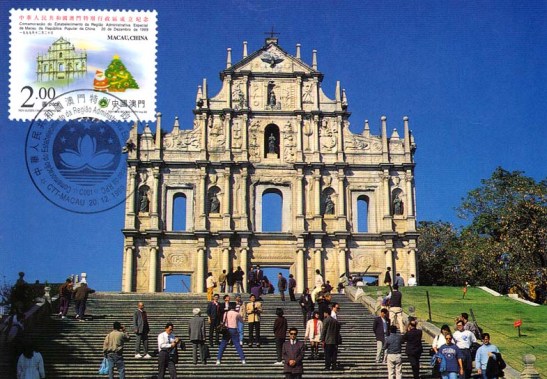 bilhete postal selado das Ruínas de São Paulo, uma das sete maravilhas de origem portuguesa no mundo