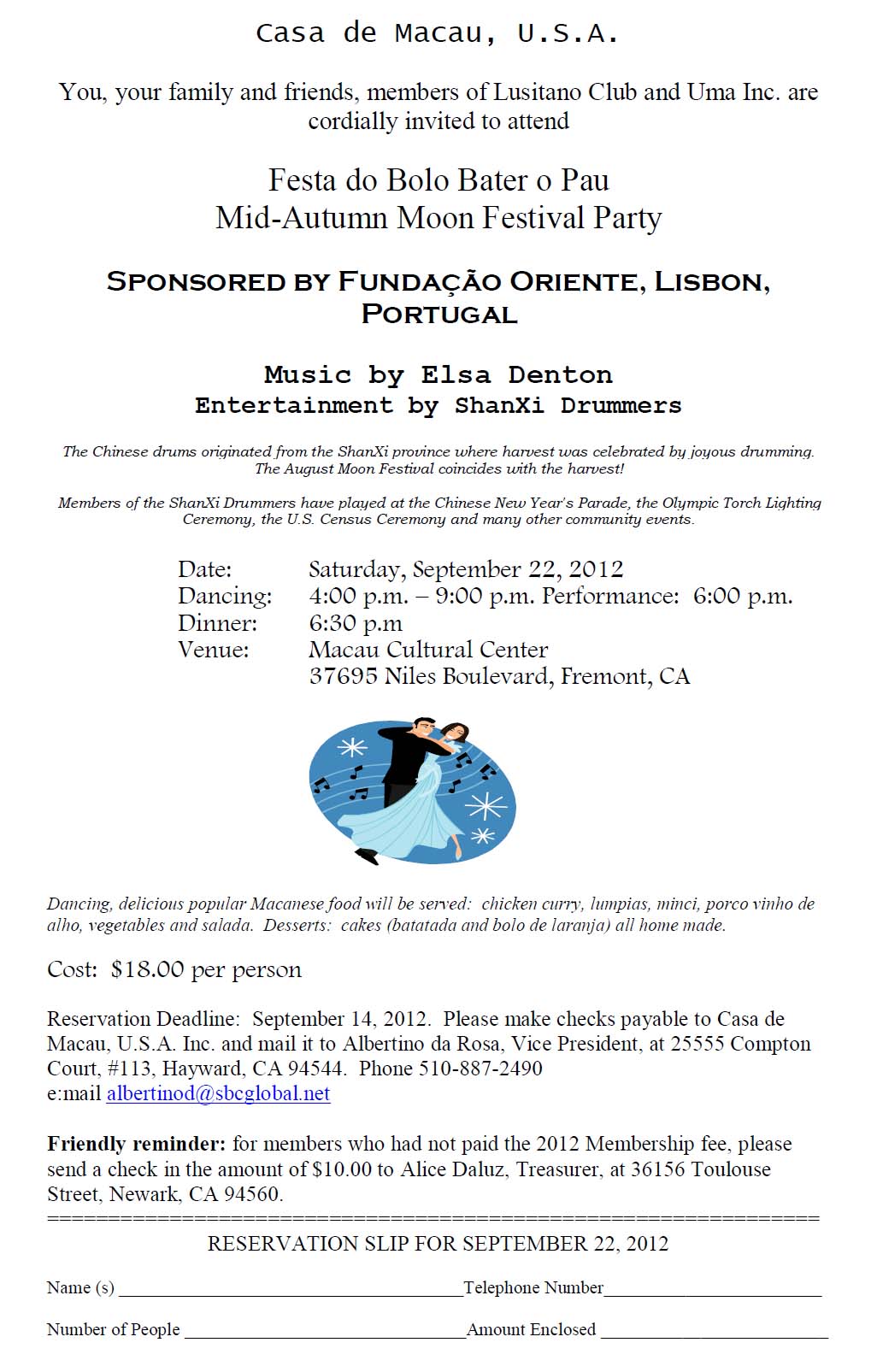 Recebi do Henrique Manhão, da Casa de Macau, USA (EUA), o convite para a Festa do Bater o Pau (Mid-Autumn Moon Festival Party) que publico abaixo, para que saibam das atividades da diáspora macaense no mundo. Sucesso e excelente festa amigos da Califórnia. Bom ver que conta com o patrocínio da Fundação Oriente!
