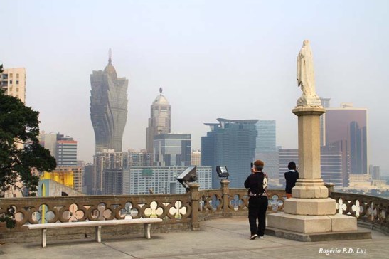 Vista panorâmica de Macau com a torre do prédio mais alto do Hotel Casino Gran Lisboa, parcialmente encoberta por névoa. A estátua da Nossa Senhora do Bom Parto contempla a cidade.