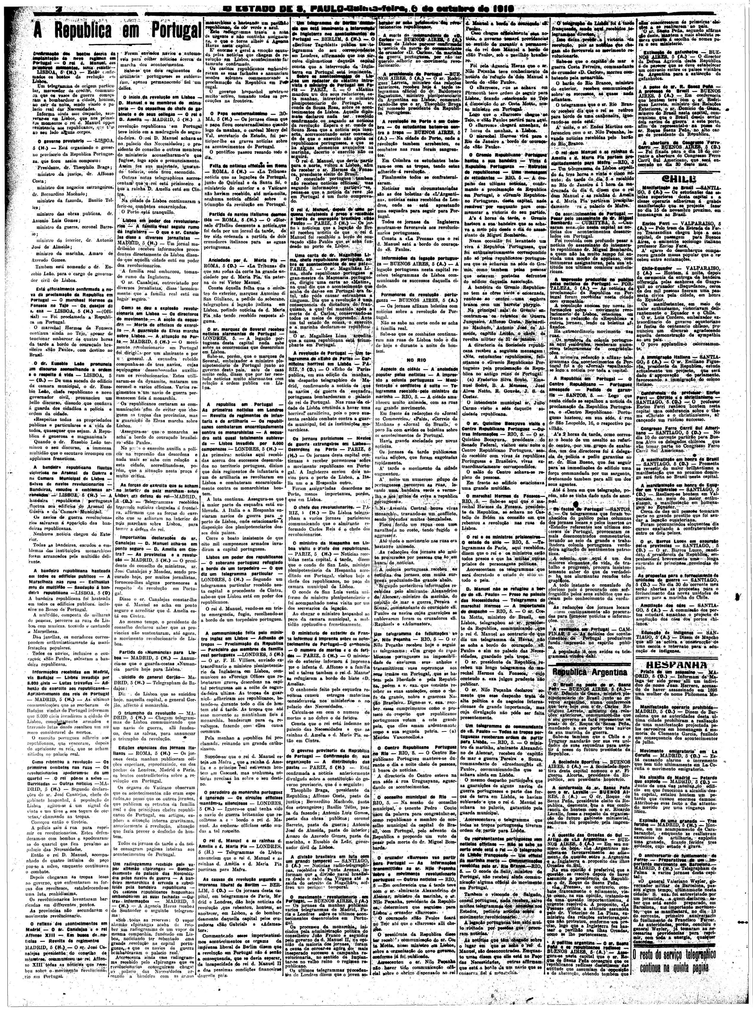 Clique na imagem (arquivo de 1,5 Mb) abaixo para ver o que o jornal do Brasil: O Estado de São Paulo (nome atual do diário) publicou a respeito da primeira notícia da “A República em Portugal” na sua edição de 6 de Outubro de 1910 (extraído do acervo digital do jornal):