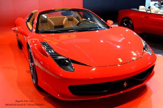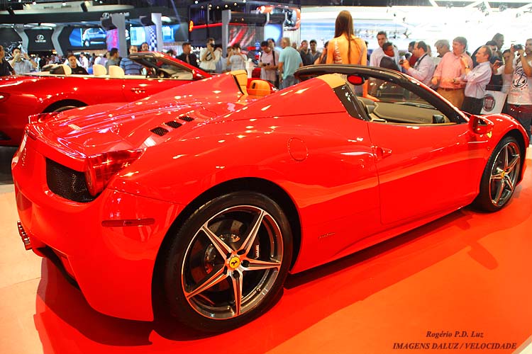 A Ferrari 458 Spyder exposta no stand da Fiat é equipado de motor V8 de 570 cavalos de potência. Eleito o motor do ano em 2011, este propulsor atinge velocidade máxima de 320 km/h e acelera de 0 a 100 km/h em 3s4. Custa R$ 1.950.000 no Brasil ou cerca de US$ 950mil.
