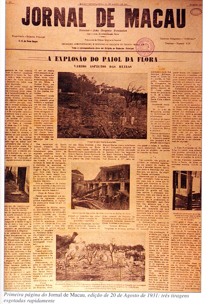 Sob o título “Macau de luto — a explosão do Paiol da Flora”, o Jornal de Macau (propriedade de Rosa Duque) referia-se, nestes termos, na primeira página da sua edição de 15 de Agosto de 1931, à tragédia da antevéspera.