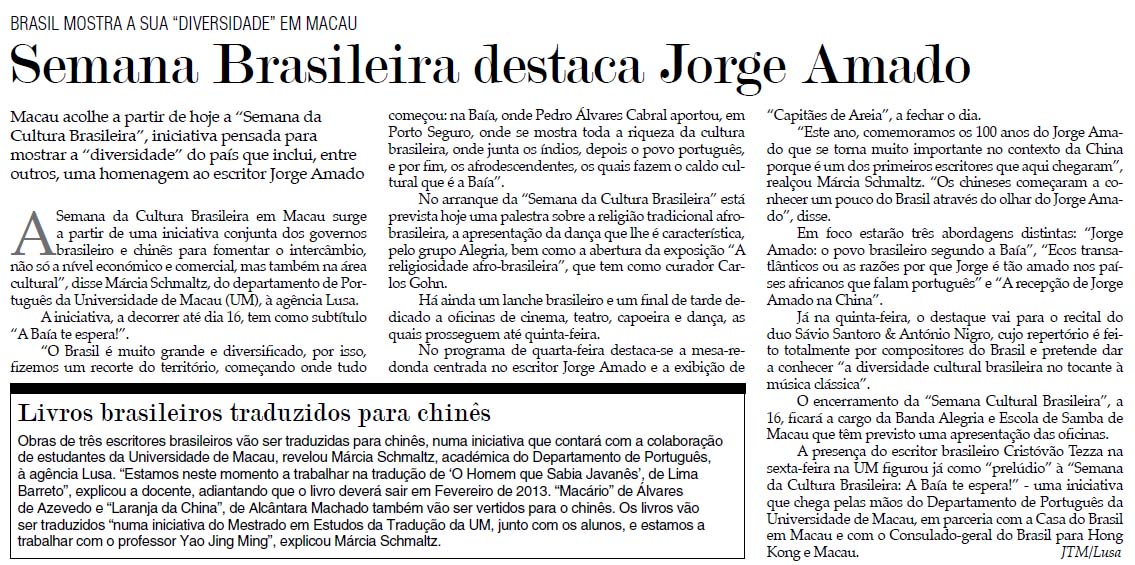 Duas notas publicadas no Jornal Tribuna de Macau da edição desta data merecem ser publicadas. Uma se refere a publicações literárias com Jorge Amado em destaque. Para quem não saiba, Jorge Amado é o autor do livro de 1958: “Gabriela, Cravo e Canela“, cujo tema foi objeto de telenovelas em 1960, 1975 e agora em 2012, além do filme de 1983 estrelado por Sônia Braga e Marcello Mastroianni. Aliás, apesar de algumas opiniões desfavoráveis, adorei a versão de 2012 em forma de mini-série e a performance de Juliana Paes. Torço para que Macau, Portugal e outros países tenham oportunidade de ver esta nova versão, mais divertida e bem produzida. Vejam aqui o site desta de 2012.