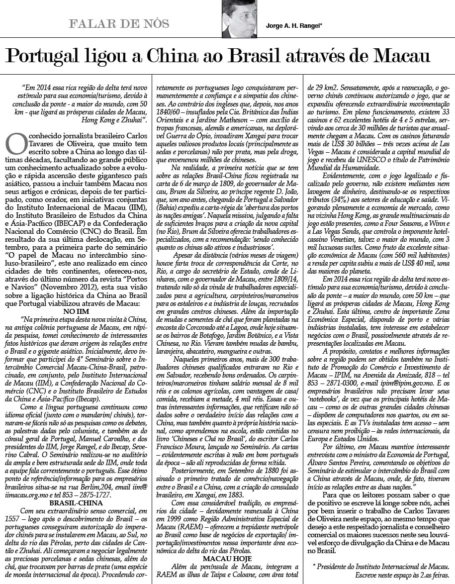 Outra, uma crônica de Jorge Rangel, presidente do Instituto Internacional de Macau, que volta e meia está no Brasil para suas atividades profissionais, fala do recente artigo escrito pelo jornalista brasileiro Carlos Tavares de Oliveira, que trata da “ligação histórica da China ao Brasil que Portugal viabilizou através de Macau“: