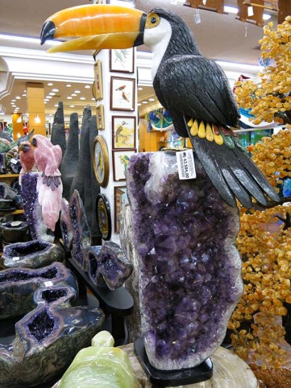 Tucano em dolomita preta e calcita laranja com base em ametista. Preço R$ 42.504,00 (cerca de US$ 19.300 ou MOP 155.000)