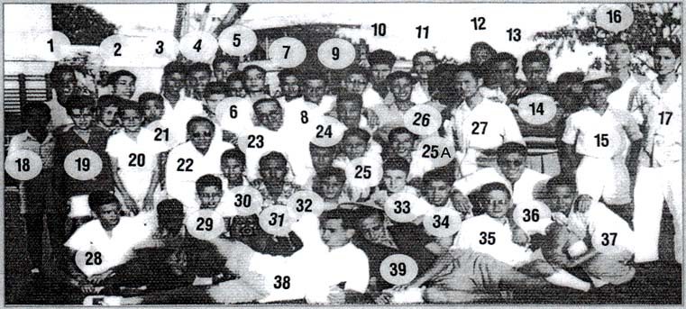 Para facilitar a identificação, começamos hoje em plano recuado: l) Eurico Viana; 2) Alexandre da Rosa; 3) Geraldo Gomes; 4) Daniel Costa do Rosário; 5) Manuel Francisco Cordeiro (Neco); 6) Mário Nogueira (Jambolão); 7) Jorge Robarts (Giga); 8) Ivo Luís Marques; 9) Eduardo Gracias (Antigonço); 10) Fernado do Nascimento; 11) Adolfo Batalha; 12)Humberto Viana; 13) José Xeque do Rosário; 14) Gilberto Silva; 15) Carlos Nates (Calim)16) Leonel Cupertino Jorge (Lelé); 17) Gustavo Batalha; 18) José das Neves; 19) Vasco Silva (Keu Keu); 20) Rui Valente de Carvalho; 21) Henrique da Luz (Jap); 22) Pedro José Lobo; 23) Pe. António Gonçalves; 24) Guilherme Silva (Chá Siu); 25)Rui Ruiz; 25A) Jaime Ruiz; 26) Tito Airosa Lopes; 27) Pedro Ló da Silva; 28) José Luís Marques (Nené); 29) Fernando Marinho Braga; 30) Generoso João da Silva (Góio); 31 António Pinto Cardoso (Pindérico); 32) Carlos Gonçalo dos Reis Ângelo (Chiu Chiu); 33) Cristóvão dos Santos; 34) Joaquim Pereira (Piers); 35) Numa Luís Marques; 36) Abílio Aleixo da Rosa; 37) Carlos Gomes (Sunny); 38) Nemésio Costa; 39) Edmundo Sardinha Dias.