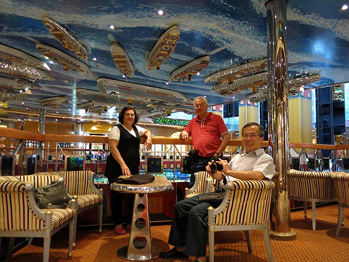 Já fomos explorar o barco em seguida e nas fotos acima e abaixo, o saguão principal do navio com 12 pisos, o 3º ao 5º, ricamente decorados. Achei muito interessante os navios antigos e atuais da Costa Cruzeiros colados no topo do 5º piso.