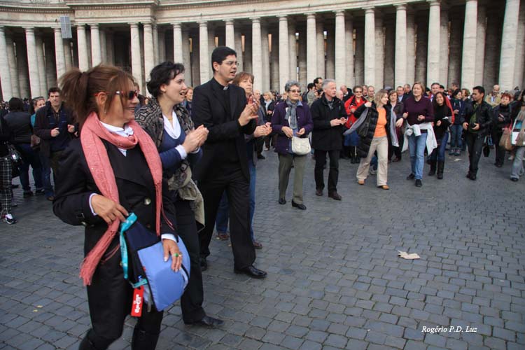 Após encerrada a cerimonia, um grupo austríaco tocava e o povo à volta dançava. Foi algo muito emocionante ver tudo isso. Era a alegria dos católicos por estarem no Vaticano