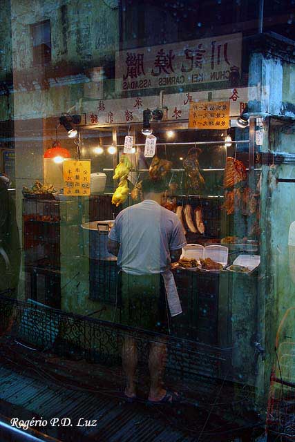 A banca de carnes assadas … siu iôc, chár siu (porco assado e carne assada) … no espaço, ou na varanda suspensa? É o reflexo na parede envidraçada do Mercado de São Domingos, no 1º andar.